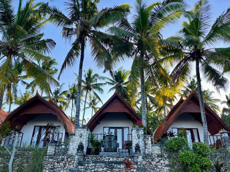 Nusa Penida ist eine große Insel und ohne Auto mit Fahrer oder Roller kommt man hier nicht weit. Ich habe mich deshalb in Laufnähe zu zwei der schönsten Strände der Insel einquartiert in einem kleinen Hotel mit nur 4 Bungalows, von einem Pärchen mit Sohn betrieben, eher einem Homestay gleichend. Der Ort war traumhaft, so wie ich es liebe: am Rand vom Dorf fernab von anderen Touristen, ruhig gelegen mitten im Grünen. Ich bezog meinen privaten Bungalow unter Palmen und wurde sogleich mit einer Kokosnuss begrüßt, die mein Gastgeber jeden Tag selbst von seinen Palmen pflückt. :-) Hier konnte ich mich erstmal von meiner nervenaufreibenden Anreise erholen. Früh und abends war meine Terrasse auch der perfekte Ort für eine Runde Yoga.