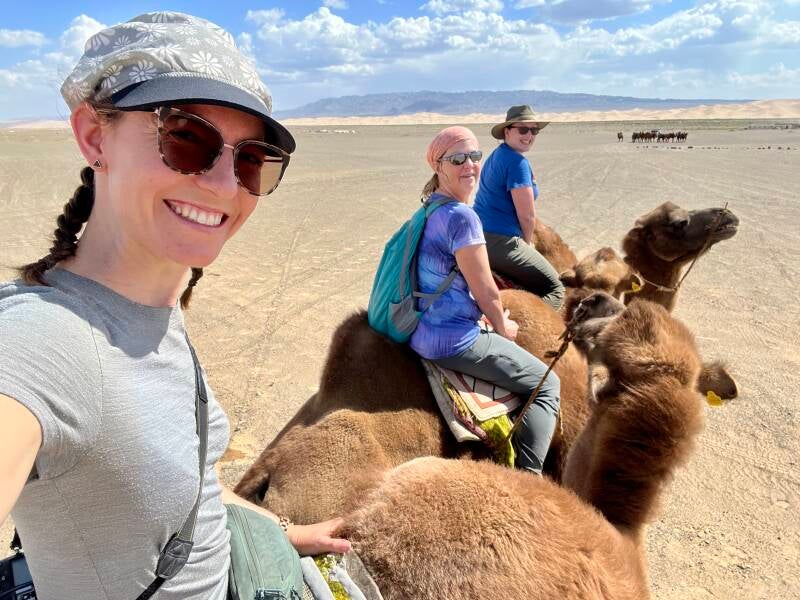 Gen Süden wird die Landschaft ab dem 2. Tag nun immer kahler und die Pferde- werden von Kamelherden abgelöst. Uns ist klar: jetzt befinden wir uns in der Gobi-Wüste. Neben einem riesigen Eingangstor zur Stadt Dalanzadgad, welche auch als Tor zur Süd-Gobi bekannt ist, befinden sich futuristische Statuen von drei Schwestern, welche laut Sage sich dem Wunsch ihres wohlhabenden Vaters zu Heiraten verweigerten und als Strafe heute versteinert als Berge in der Gobi Wüste stehen.
